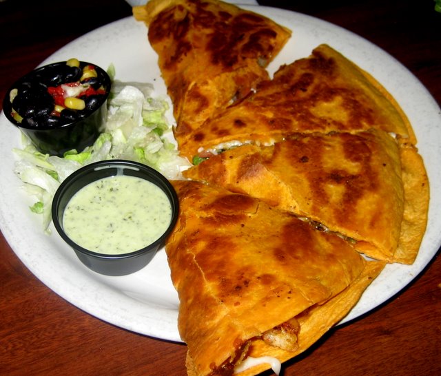 Flour tortillas filled with queso, pico de gallo, and fresh blackened shrimp. It is served with cilantro lime dipping sauce and a side of black bean corn relish. These quesadillas are stuffed well and are pretty tasty on their own, mostly due to the blackened shrimp and gooey cheese. Dipping it into the cilantro lime sauce adds a new dimension to the flavor and is delicious as well.