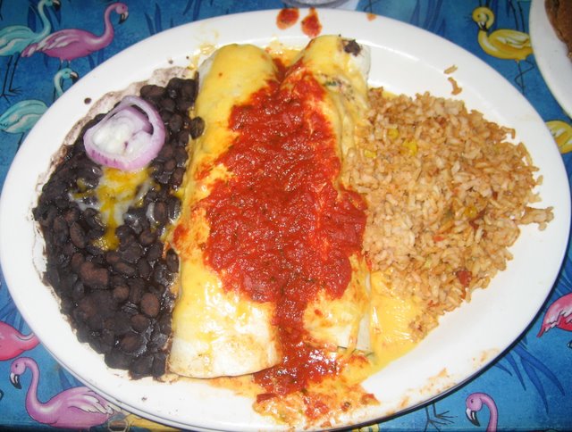 These unique enchiladas are filled with grilled chicken breast, pico de gallo, and BBQ sauce and topped with queso and chipotle. It is stuffed generously with spicy chicken. Some might find the BBQ flavor of the chicken and the Mexican spices a little conflicting. The ends of the enchiladas are a bit chewy and hard, and this dish is drier than traditional enchiladas and could use more queso.